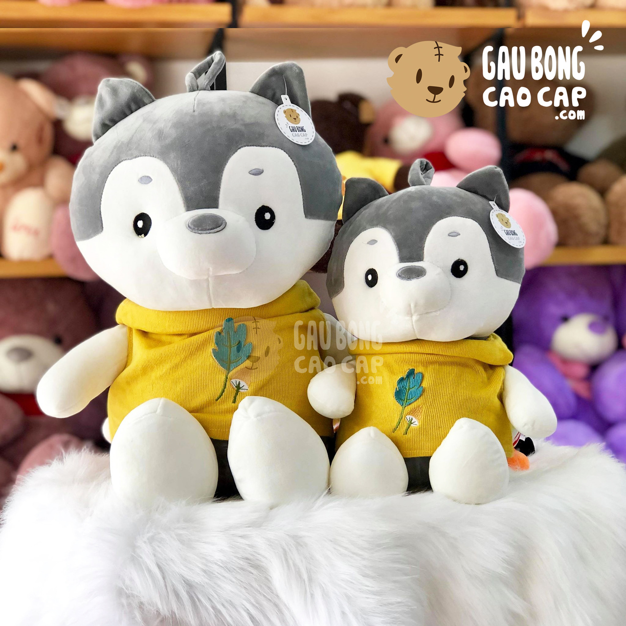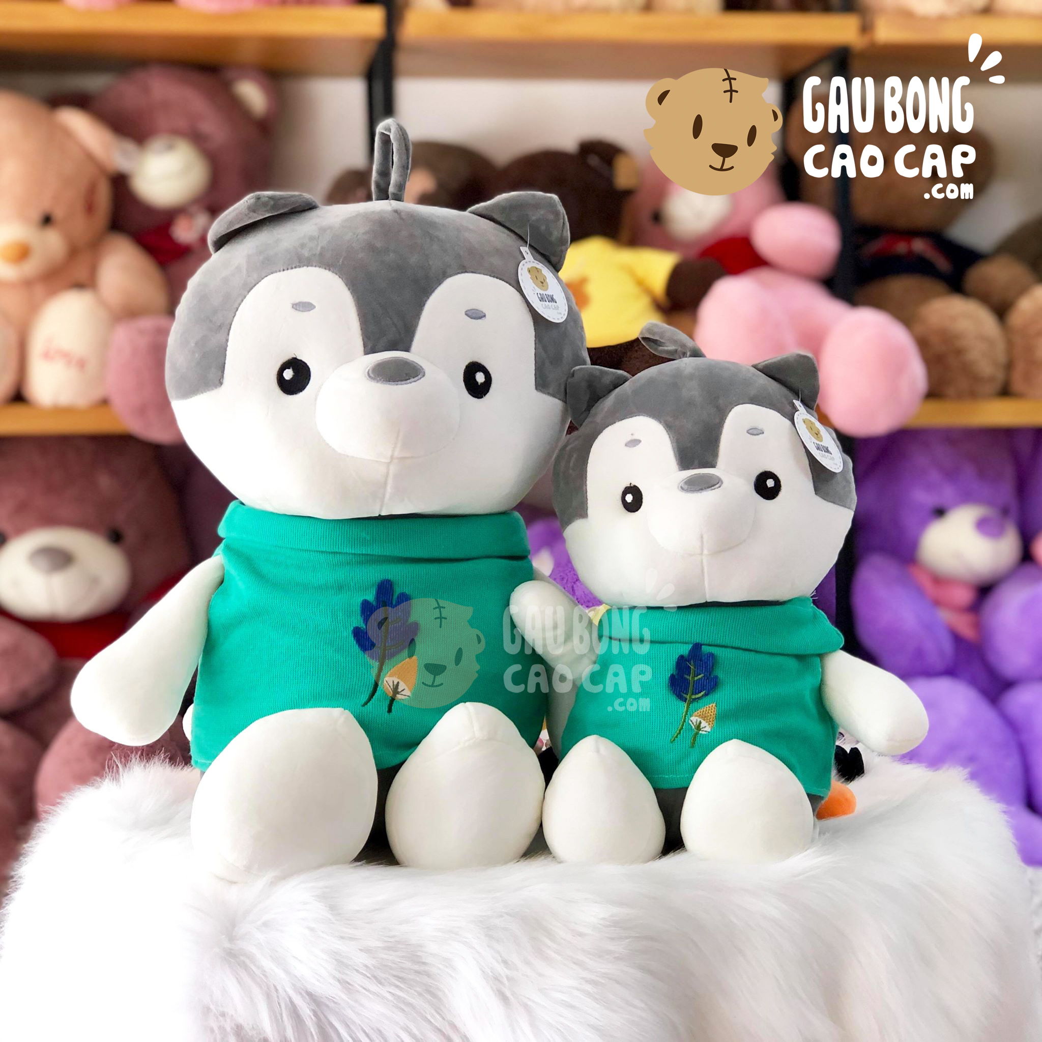 Chó Bông Husky mặc áo color thêu hình Lá được thiết kế với 2 kích thước Gấu Bông lớn nhỏ khác nhau: 45cm, 65cm