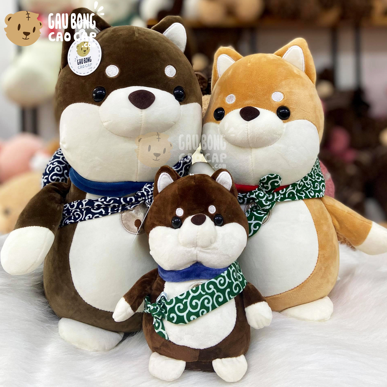 Chó Bông SHIBA đứng đeo tay nải được thiết kế với 3 kích thước Gấu Bông lớn nhỏ khác nhau: 25cm, 40cm, 50cm