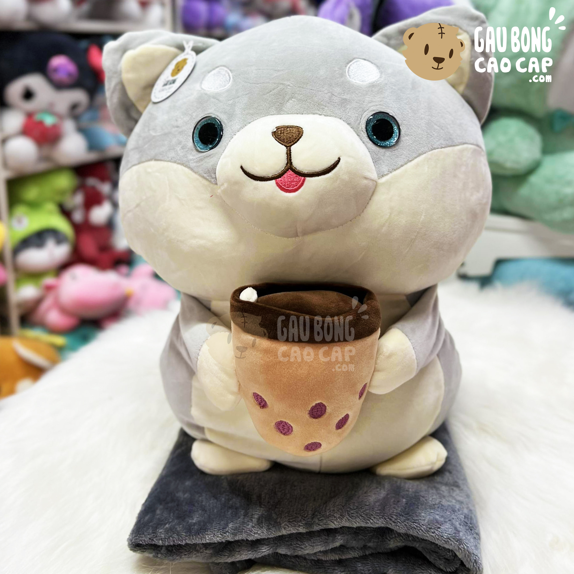 Chó Bông Shiba Xám ôm ly Trà Sữa – Gấu có mền 2in1