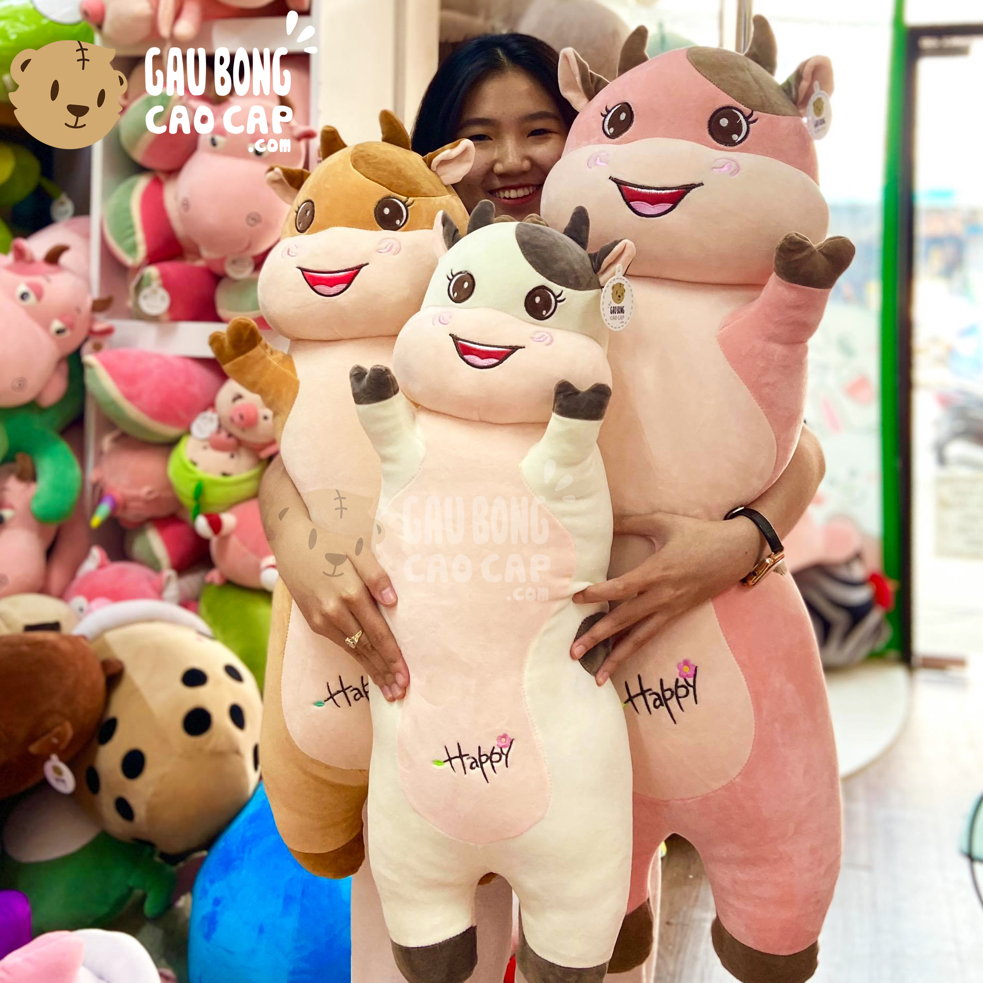 Trang Chủ / Gấu Bông Cao Cấp / Thú Bông / Gấu Bông Con Bò / Gấu Bông Bò Sữa Happy gối ôm dài đứng giơ tay