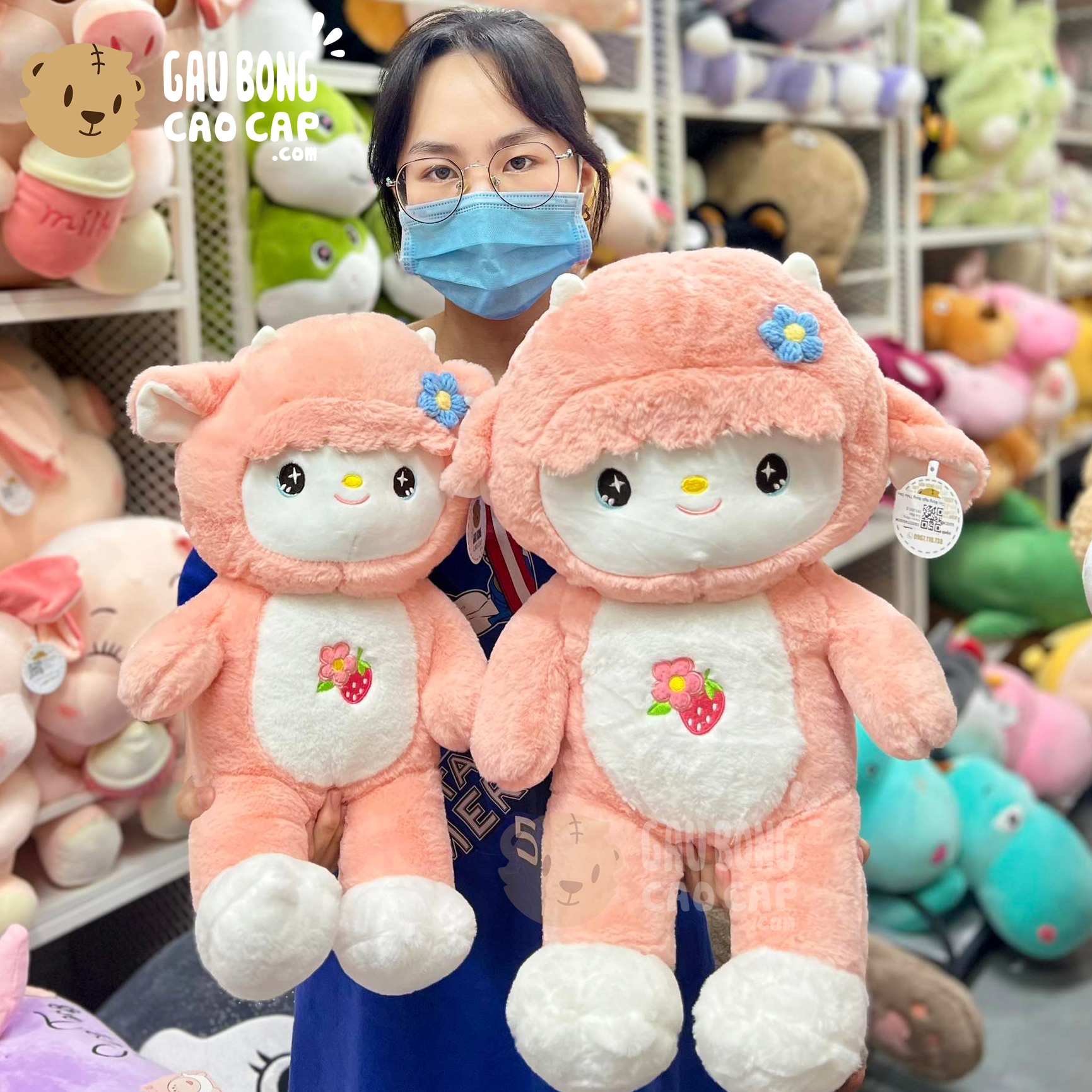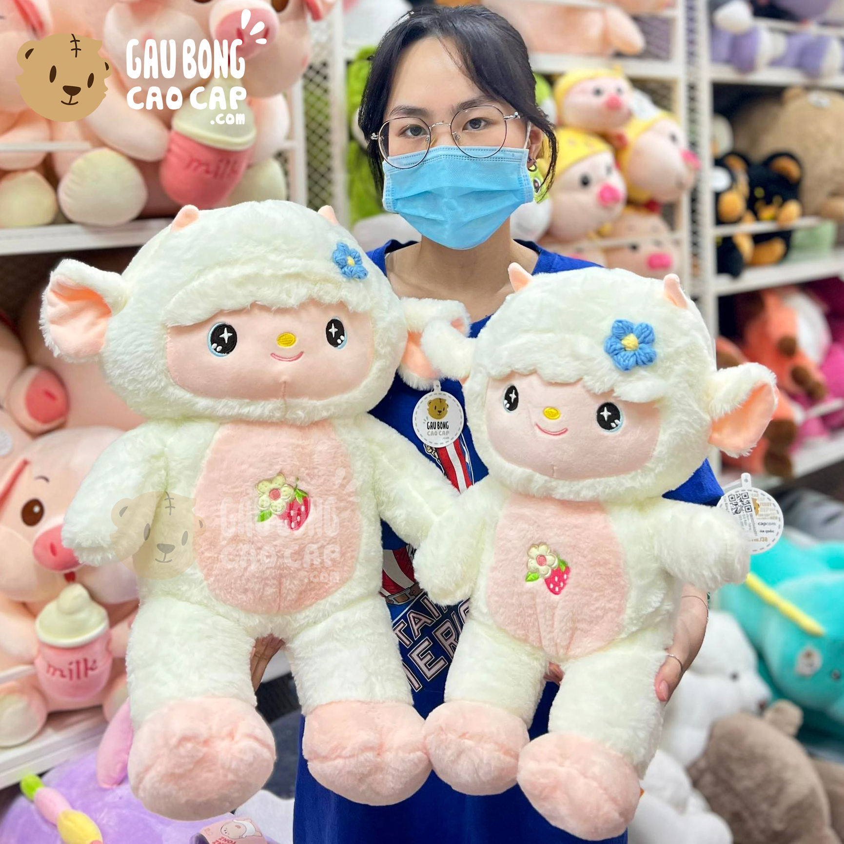 Gấu Bông Cừu bụng thêu Dâu được thiết kế với 2 kích thước Gấu Bông lớn nhỏ khác nhau: 45cm, 55cm