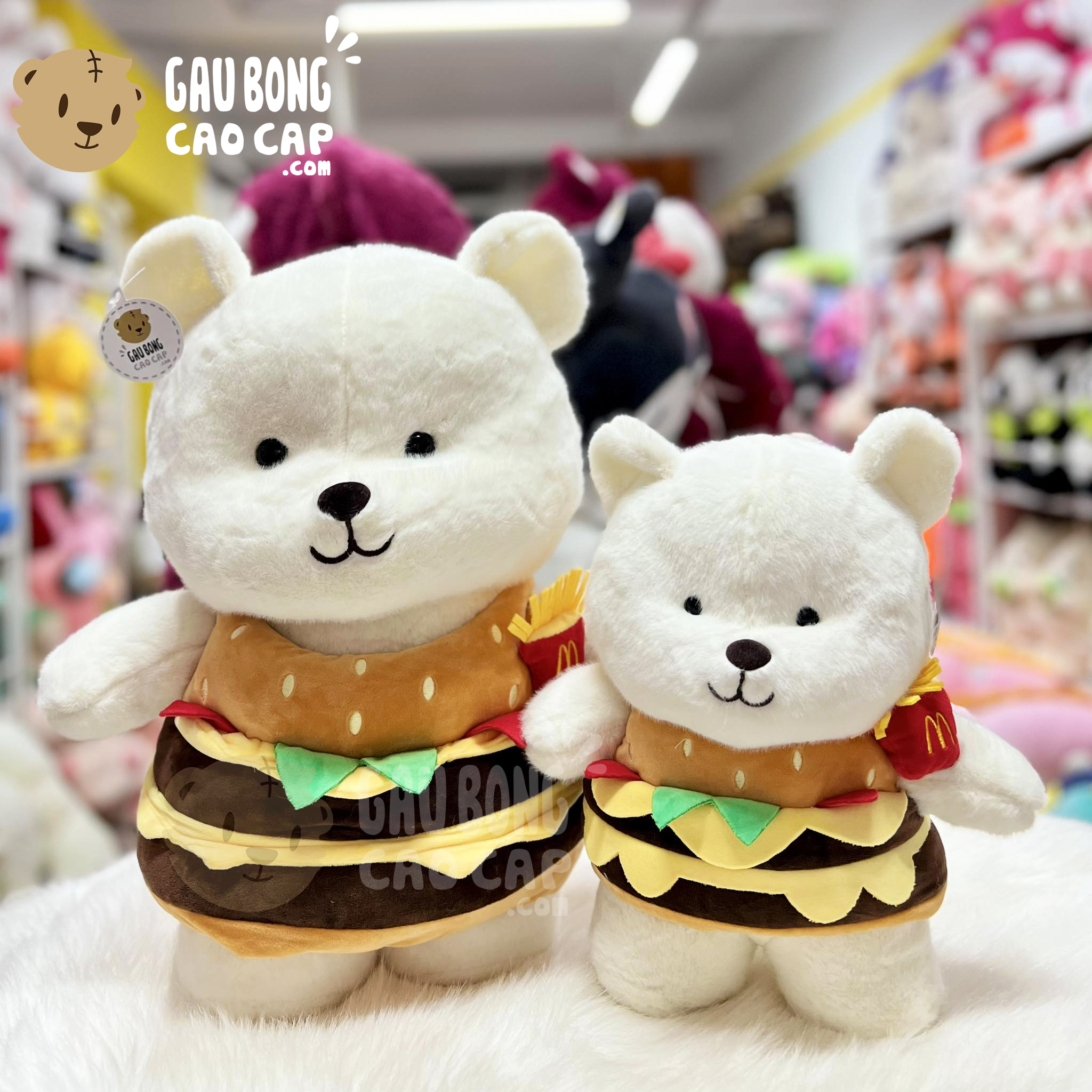 Gấu Bông Lena đứng cosplay Bánh Hamburger được thiết kế với 2 kích thước Gấu Bông lớn nhỏ khác nhau: 35cm, 50cm