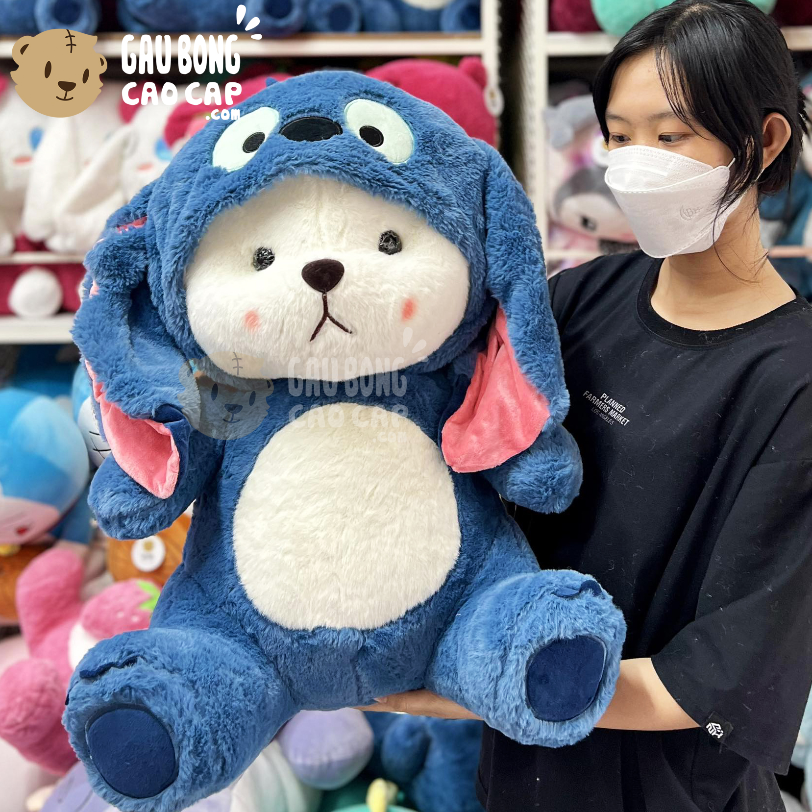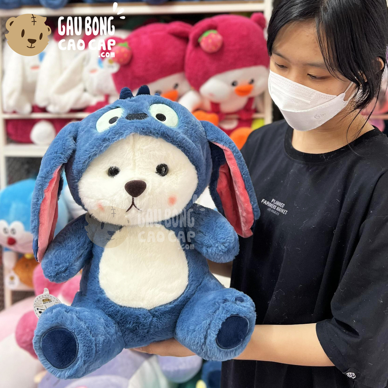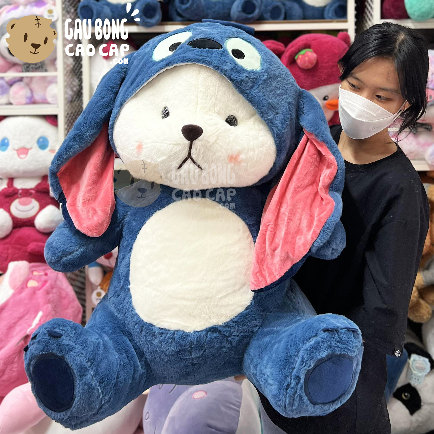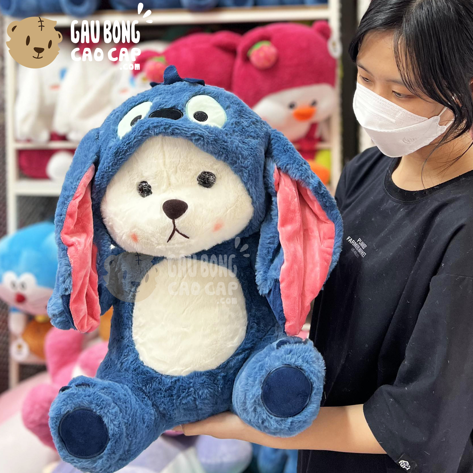 Hình ảnh Gấu Bông Lena ngồi cosplay Stitch Xanh, hình ảnh này là hình THẬT do Shop TỰ CHỤP.