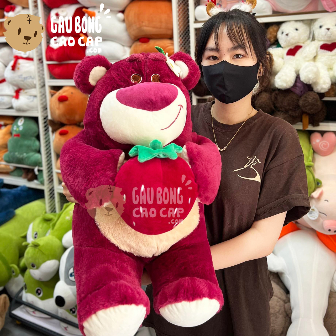 Gấu Bông Lotso ngồi ôm Dâu màu đỏ đậm được thiết kế với 4 kích thước Gấu Bông lớn nhỏ khác nhau: 48cm, 65cm, 80cm, 1m