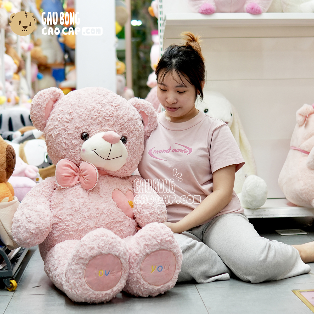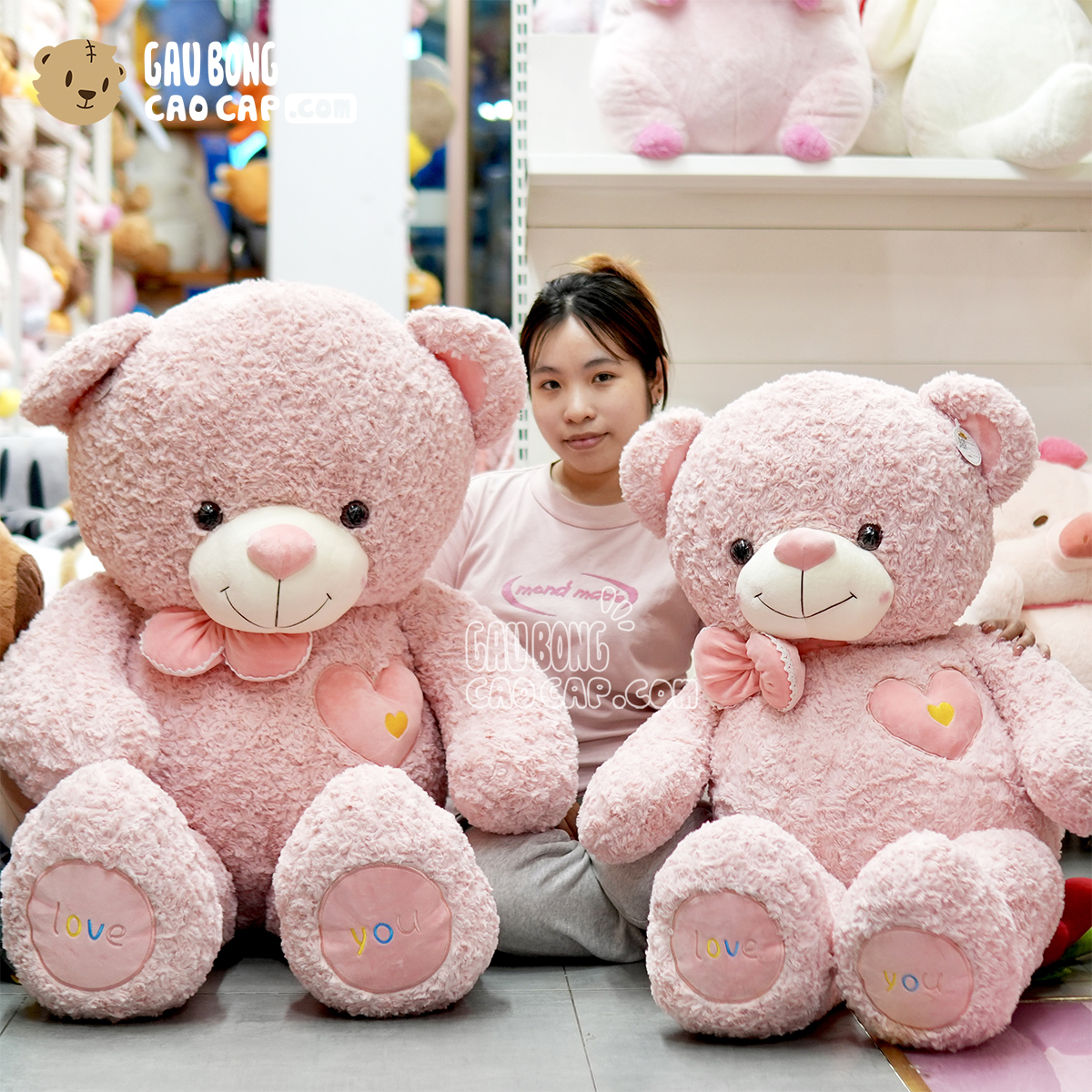 Gấu Bông Teddy Hồng Lông Xoắn Ngực Tim Đeo Nơ GẤU BÔNG TEDDY