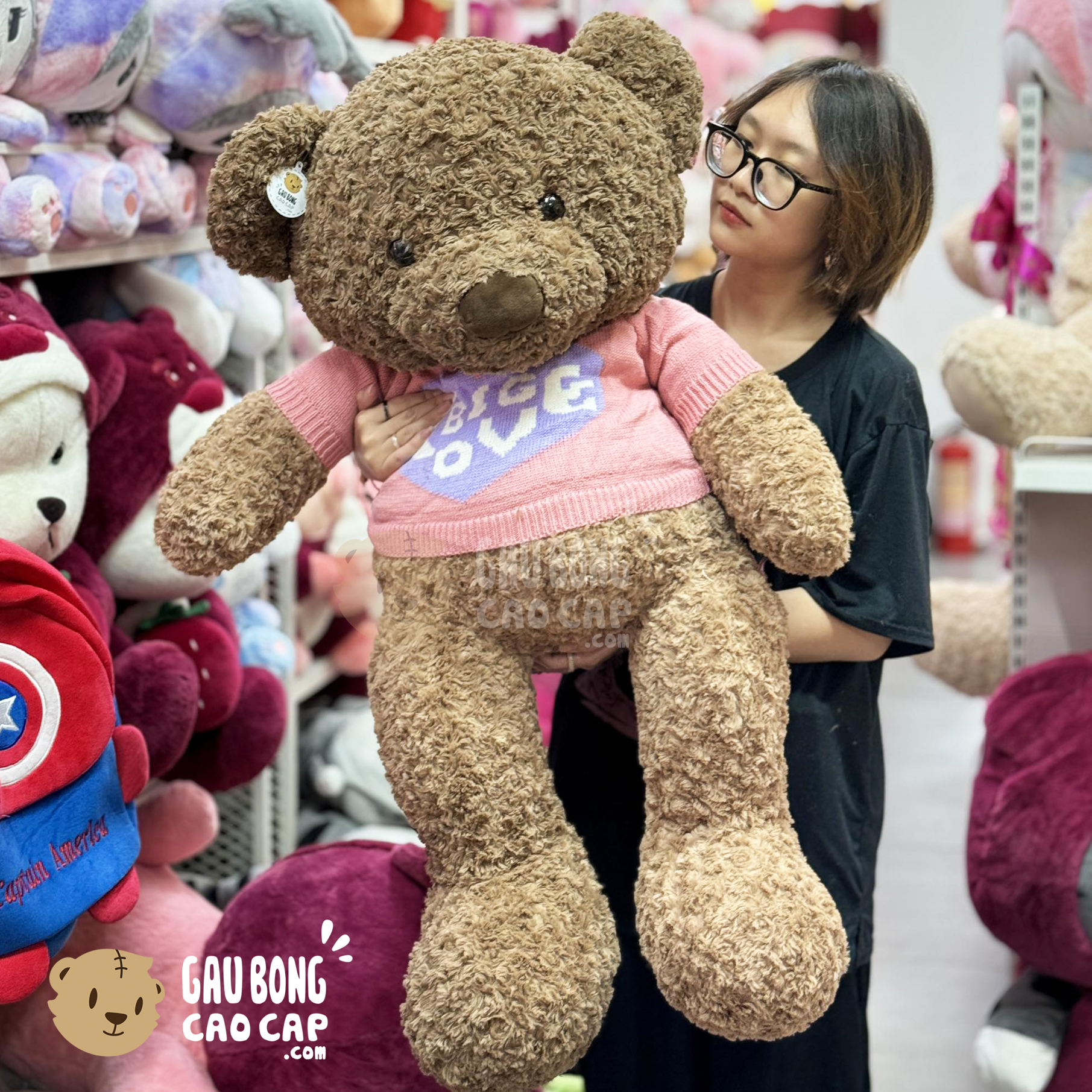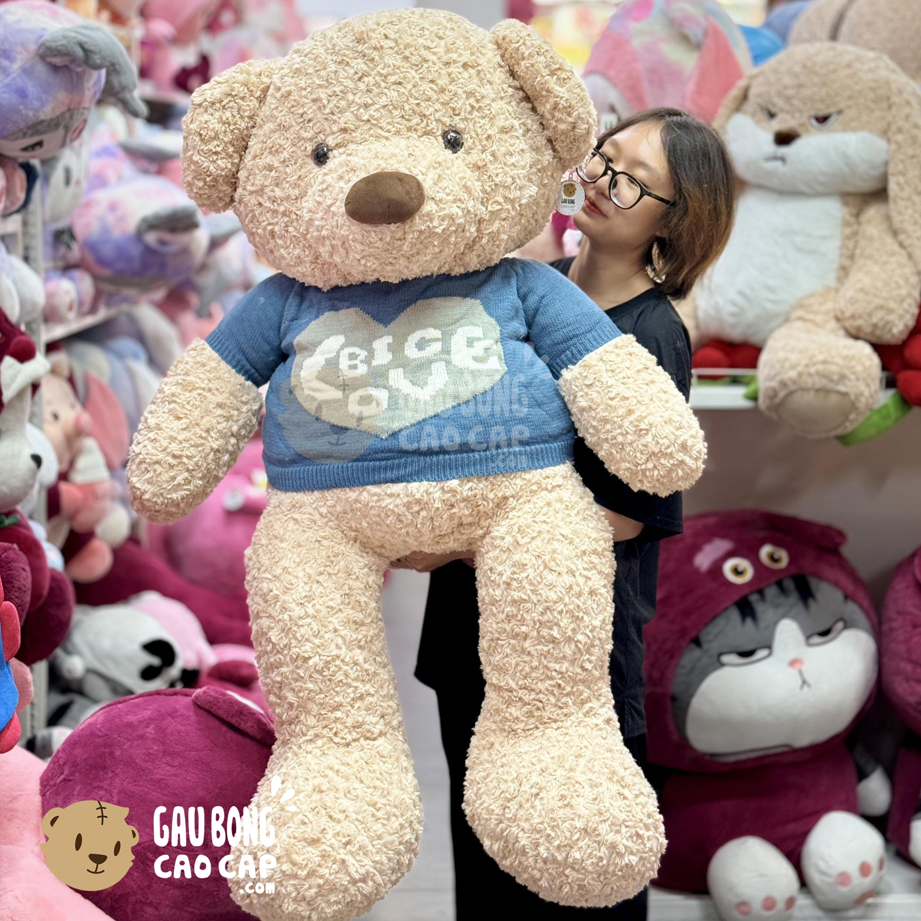 Gấu Bông Teddy mặc áo len Big Love được thiết kế với 4 kích thước Gấu Bông lớn nhỏ khác nhau: 1m, 80cm, 1m2, 1m5