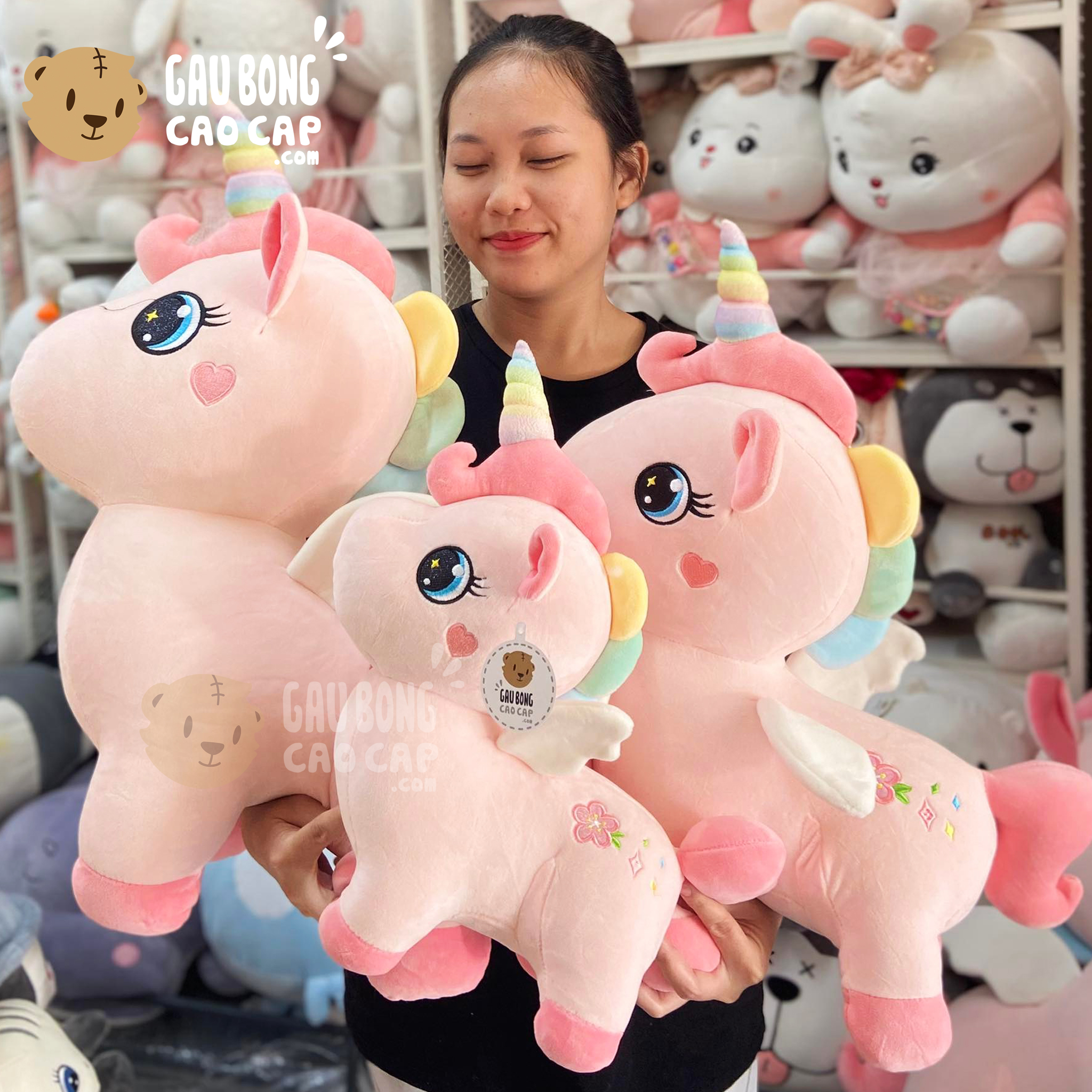 Gấu Bông Unicorn đứng 4 chân má thêu Trái Tim được thiết kế với 4 kích thước Gấu Bông lớn nhỏ khác nhau: 30cm, 45cm, 55cm, 70cm