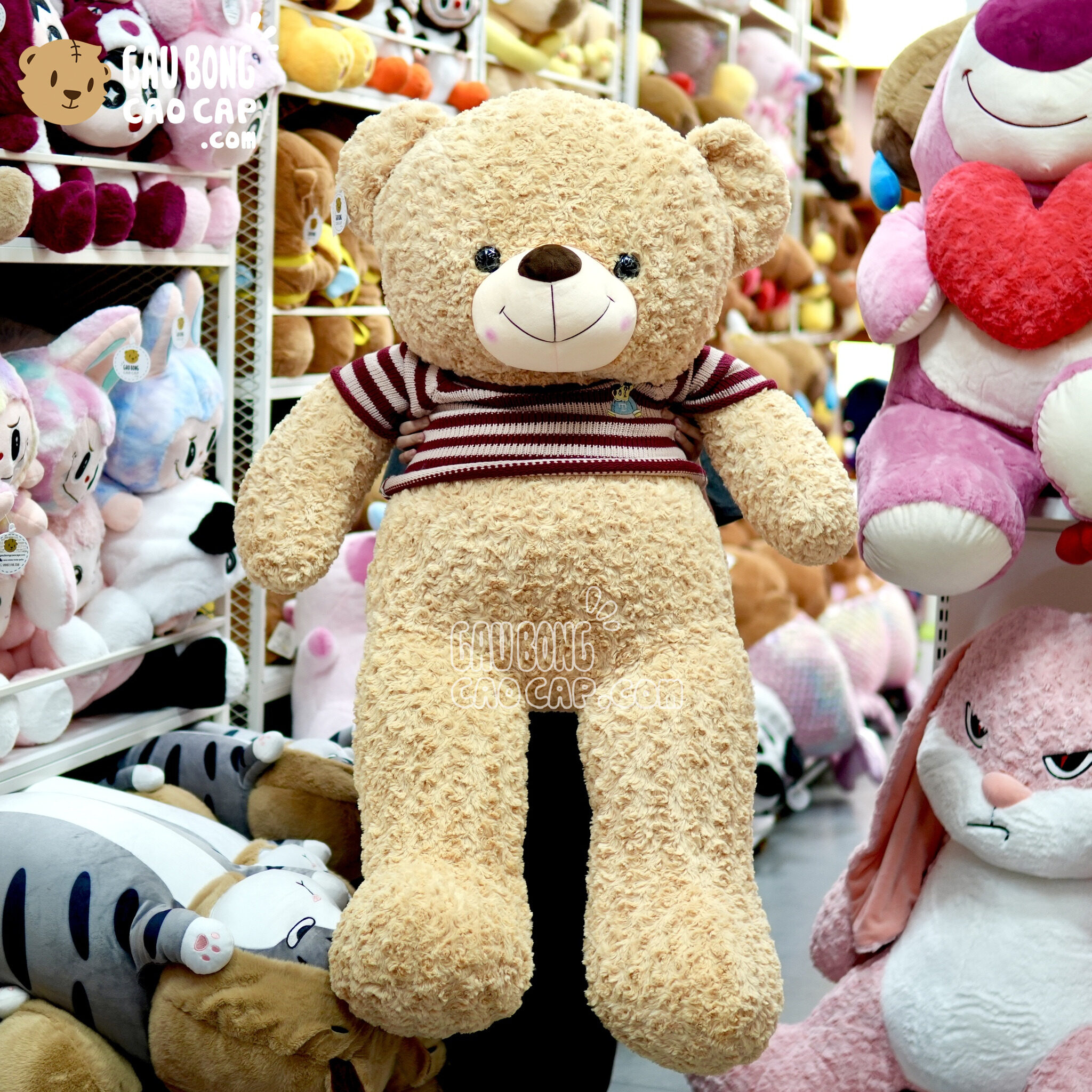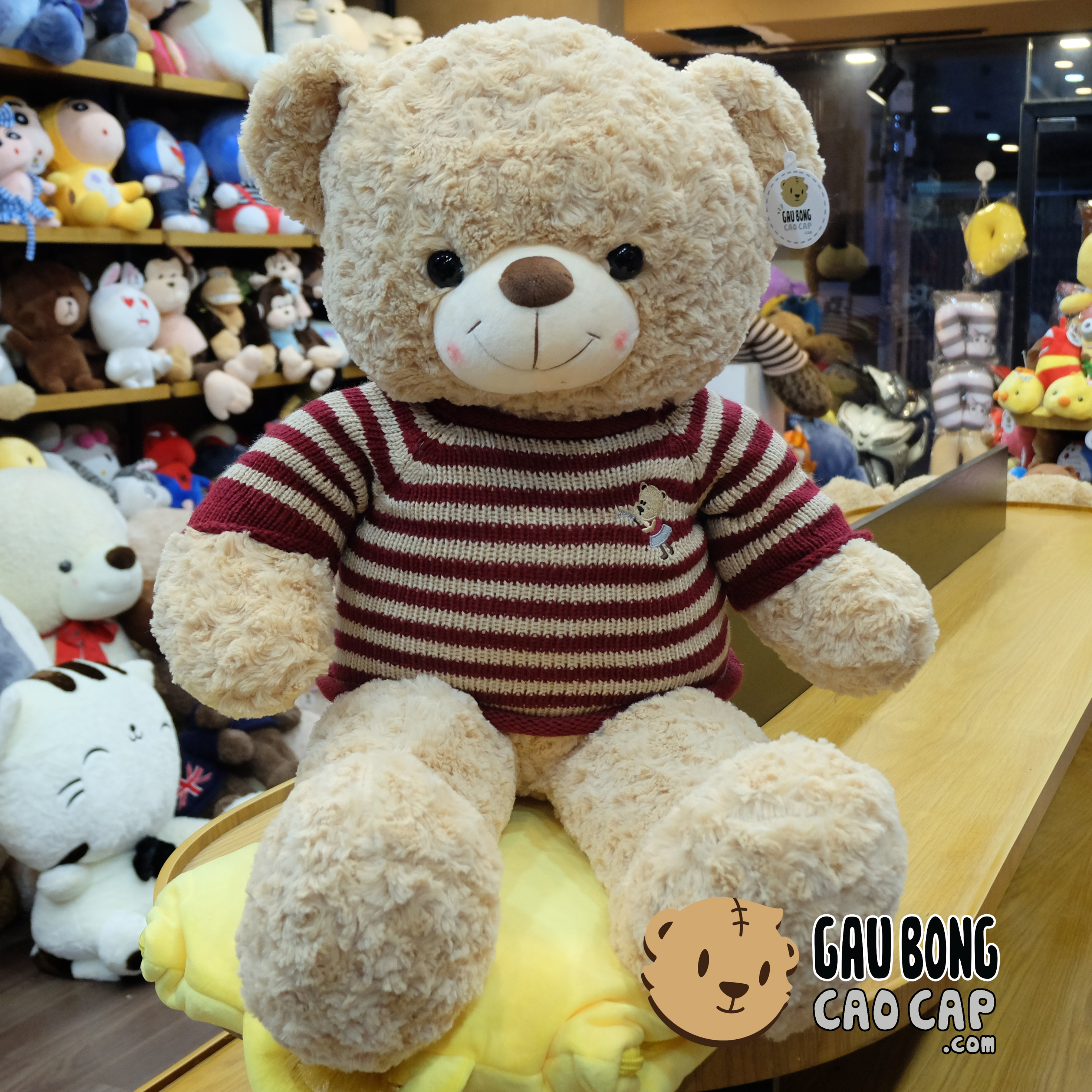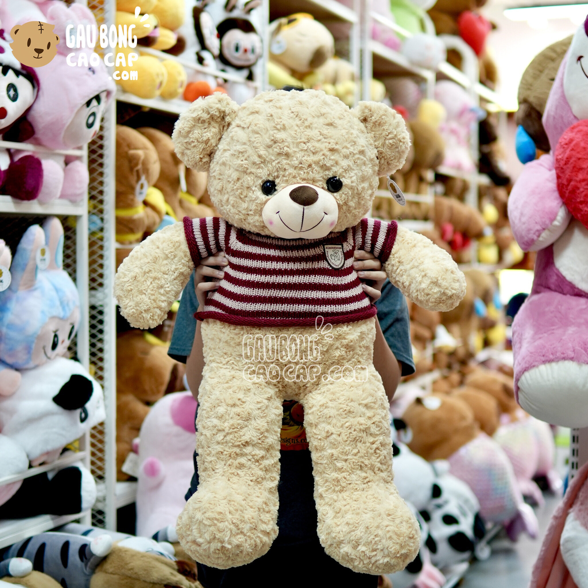 Gấu Teddy áo len cafe sữa, lông xoắn, bông căng. Áo len sọc đỏ, đường chỉ may chắc chắn.