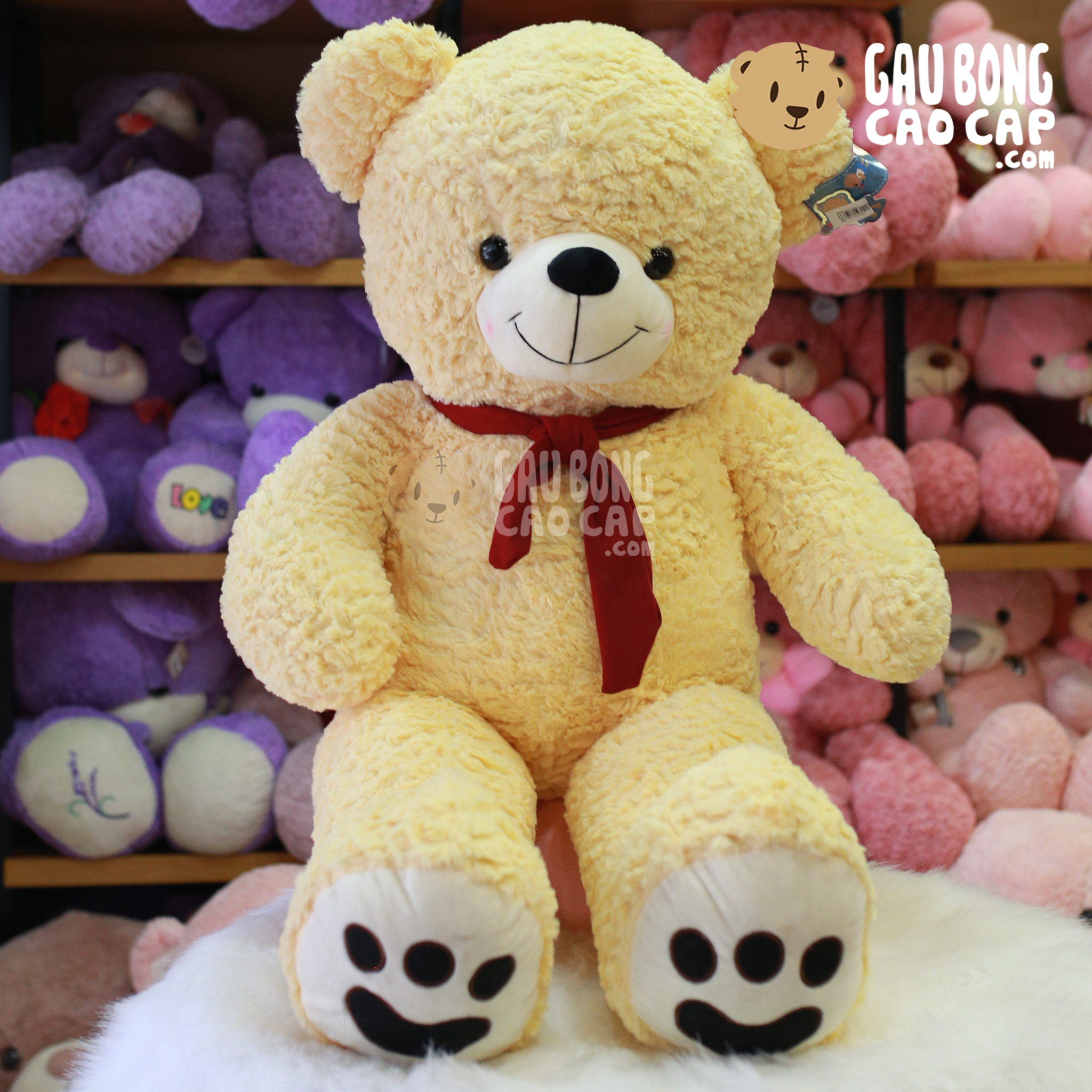 Gấu Teddy phiên bản lông layer vàng, choàng khăn len màu đỏ. Gấu rất căng bông & êm. Gấu Teddy được thiết kế form đứng, dưới chân có dấu chân gấu rất chất