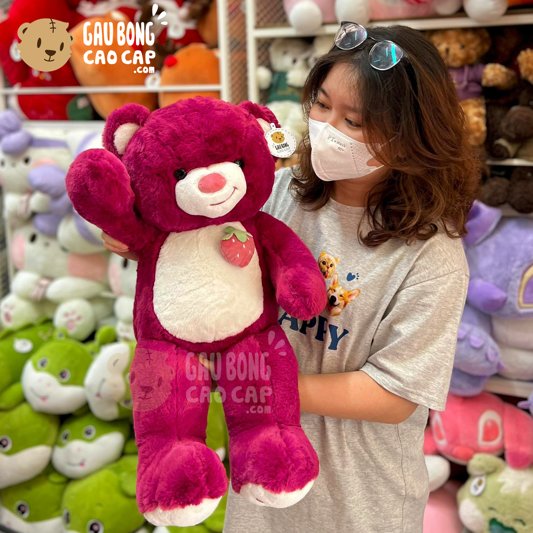 Hình ảnh Gấu Teddy Smile ngực đính Trái Dâu, hình ảnh này là hình THẬT do Shop TỰ CHỤP.