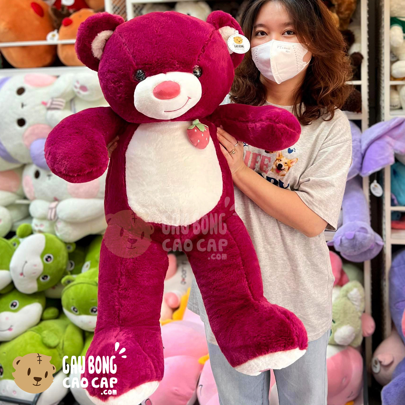 Gấu Teddy Smile ngực đính Trái Dâu được thiết kế với 5 kích thước Gấu Bông lớn nhỏ khác nhau: 60cm, 75cm, 95cm, 1m15, 1m4