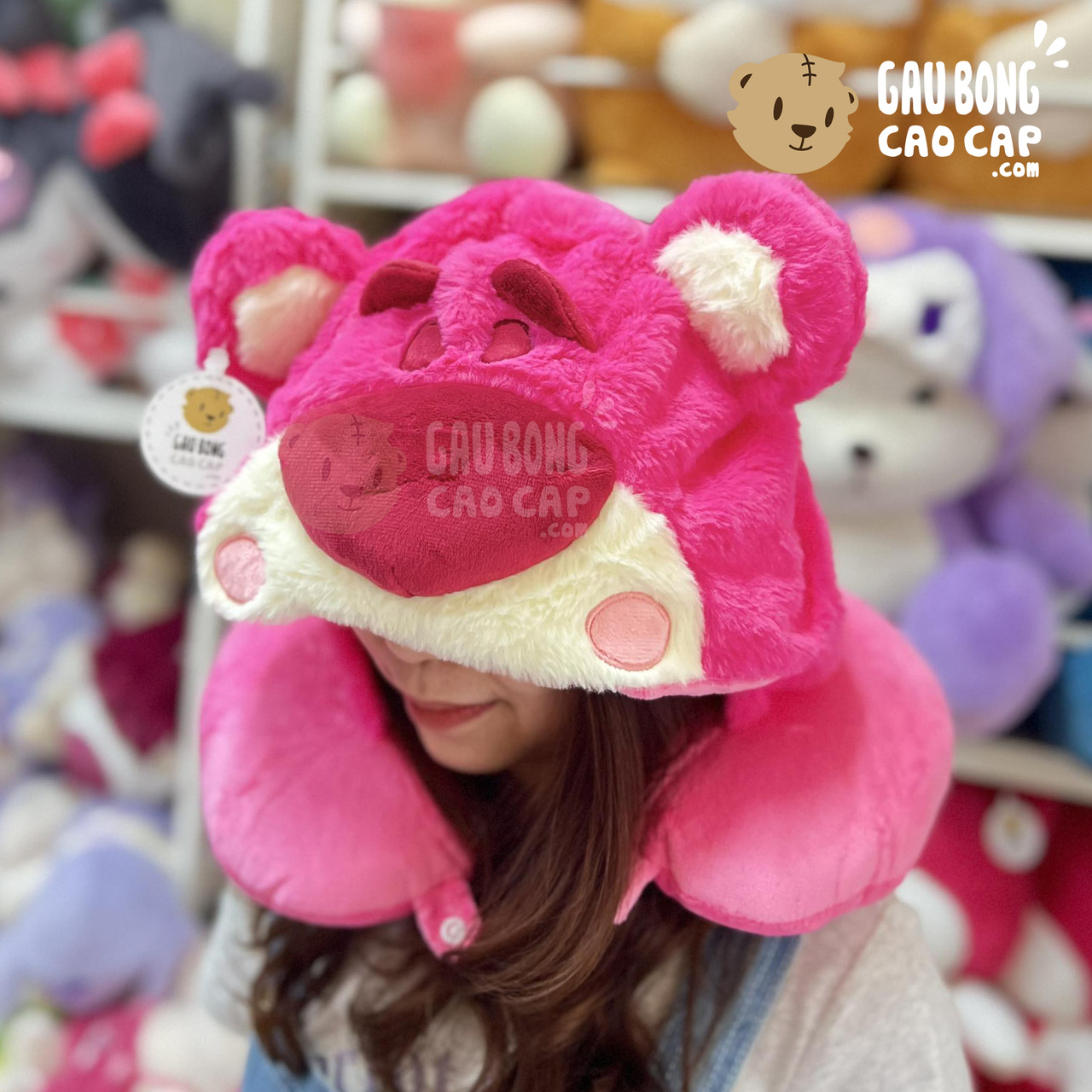 Hình ảnh Gối kê cổ Chữ U có nón - Gấu Dâu Lotso, hình ảnh này là hình THẬT do Shop TỰ CHỤP.