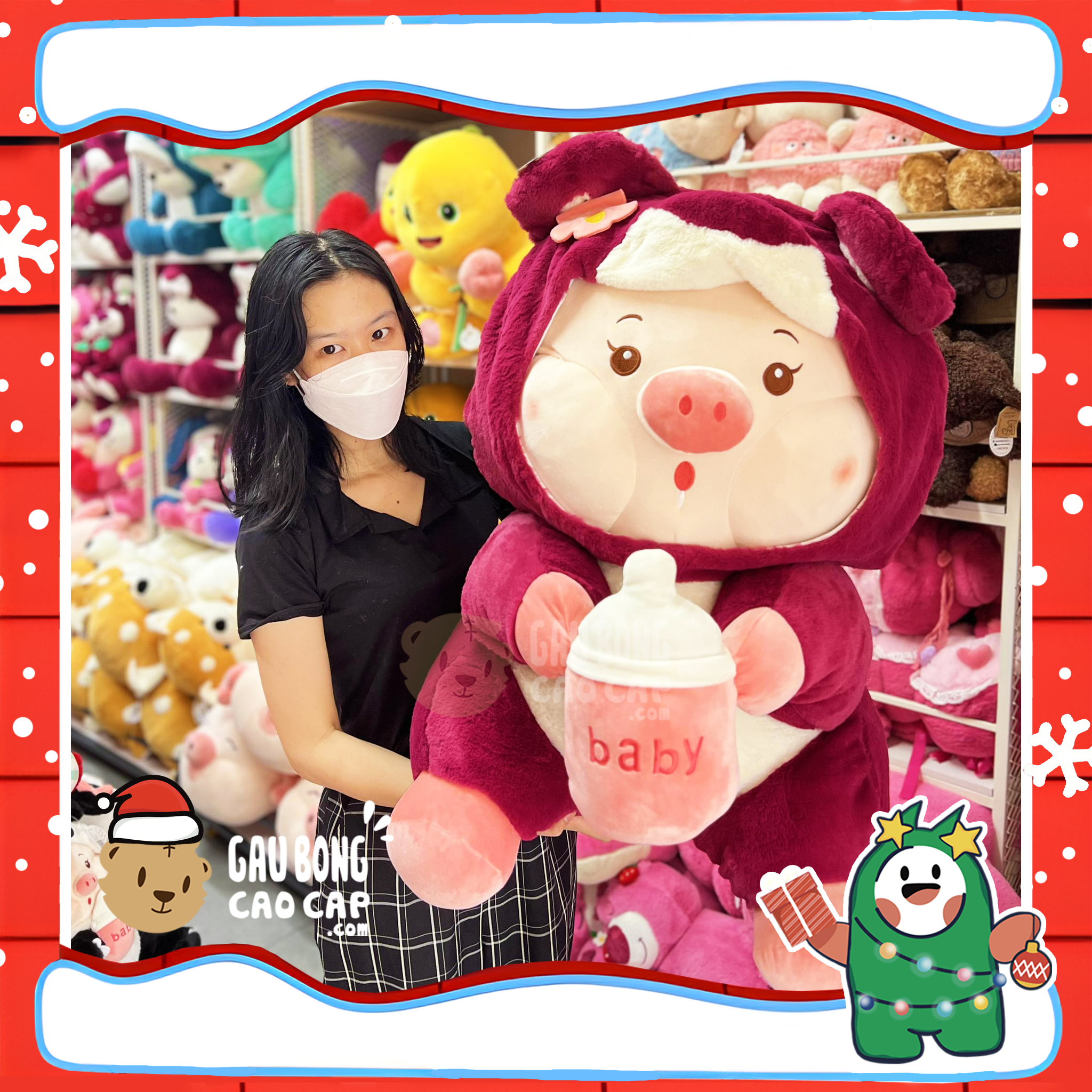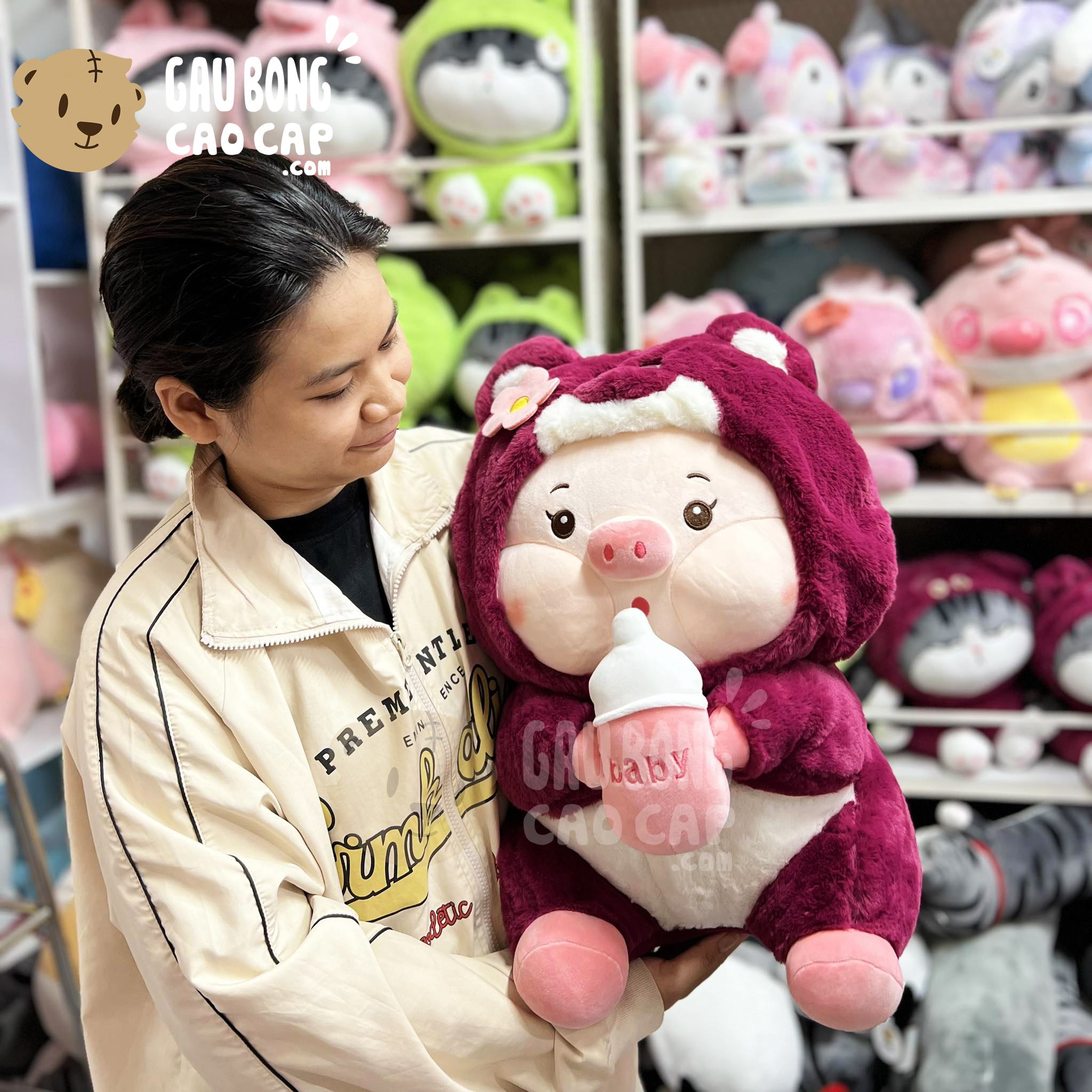 Hình ảnh Heo Bông cosplay Lotso Dâu ngồi ôm Bình Sữa, hình ảnh này là hình THẬT do Shop TỰ CHỤP.