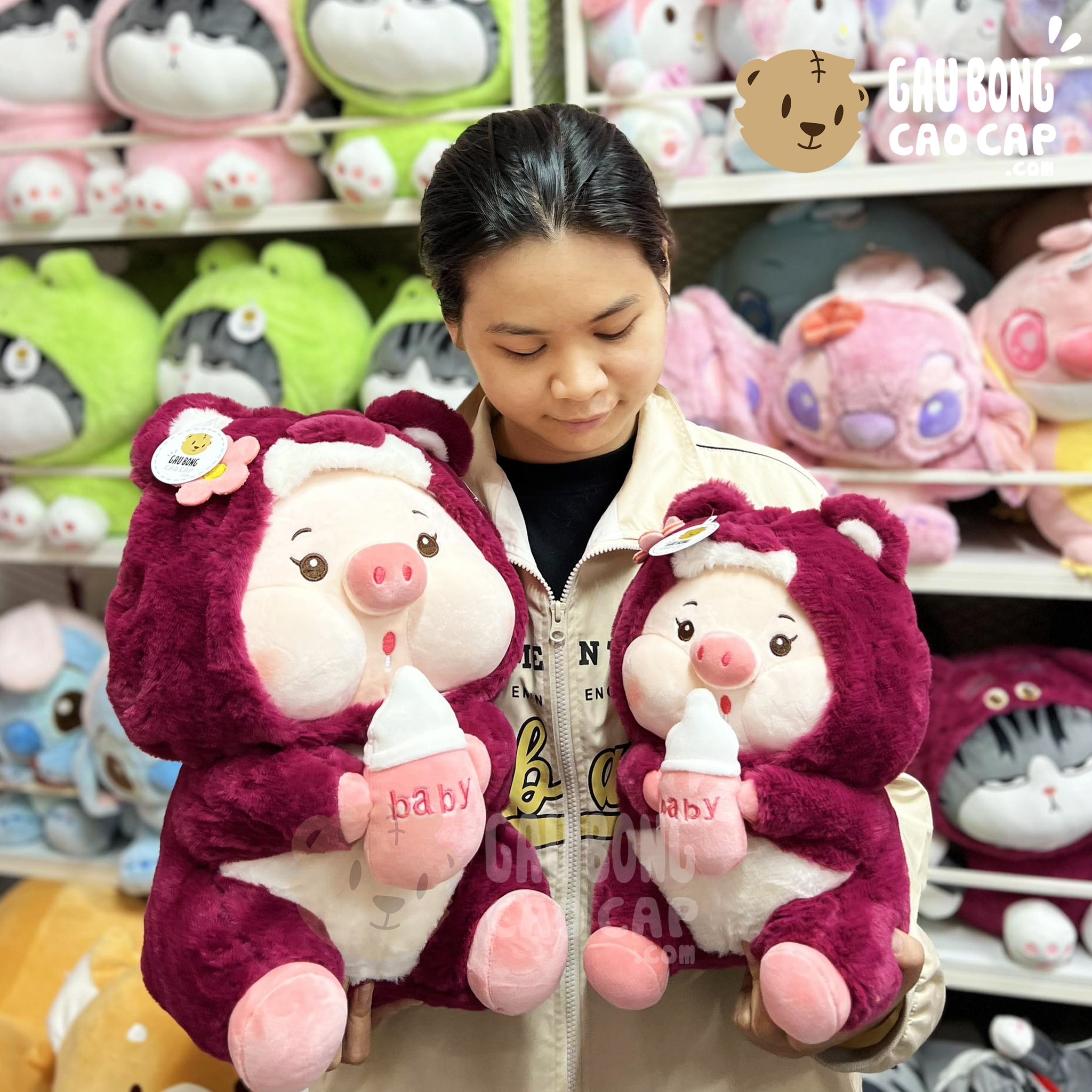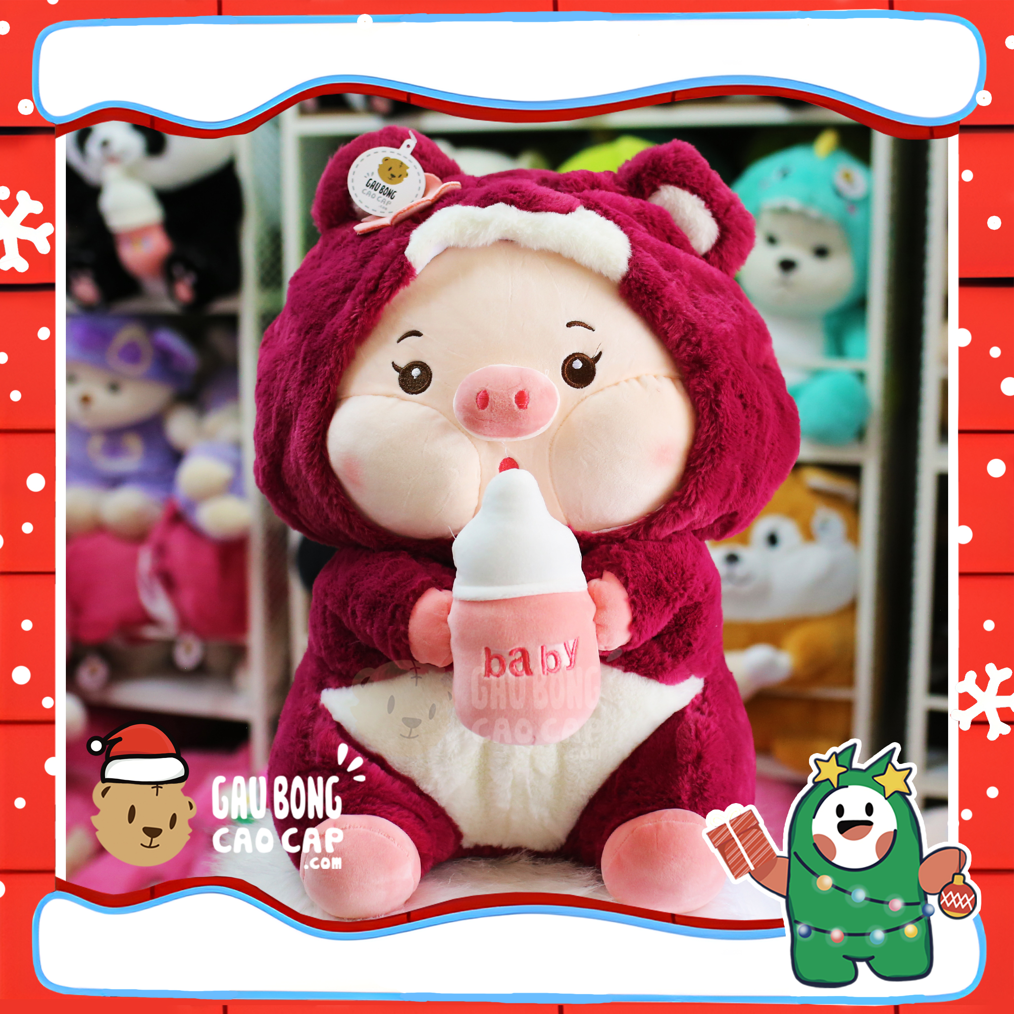 Heo Bông cosplay Lotso Dâu ngồi ôm Bình Sữa đang nằm trong danh sách những sản phẩm Gấu Bông Thú Bông BÁN CHẠY và đang được các bạn trẻ YÊU THÍCH NHẤT.