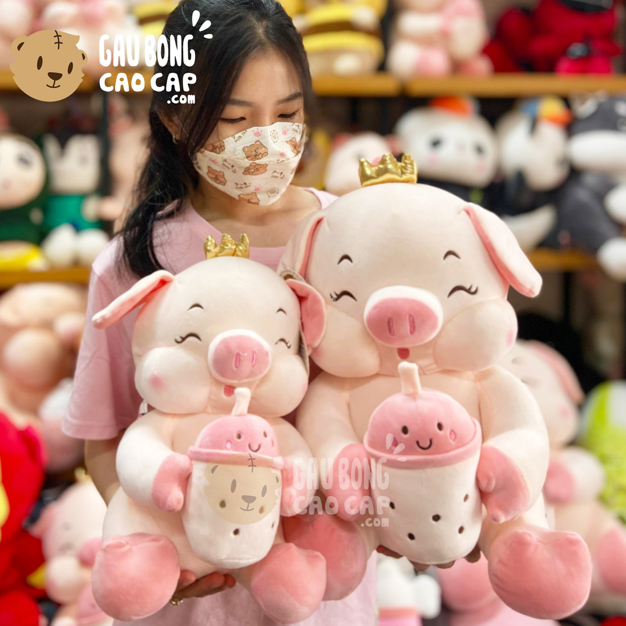 Heo Bông đội vương miện ôm ly Trà Sữa được thiết kế với 3 kích thước Gấu Bông lớn nhỏ khác nhau: 50cm, 60cm, 75cm