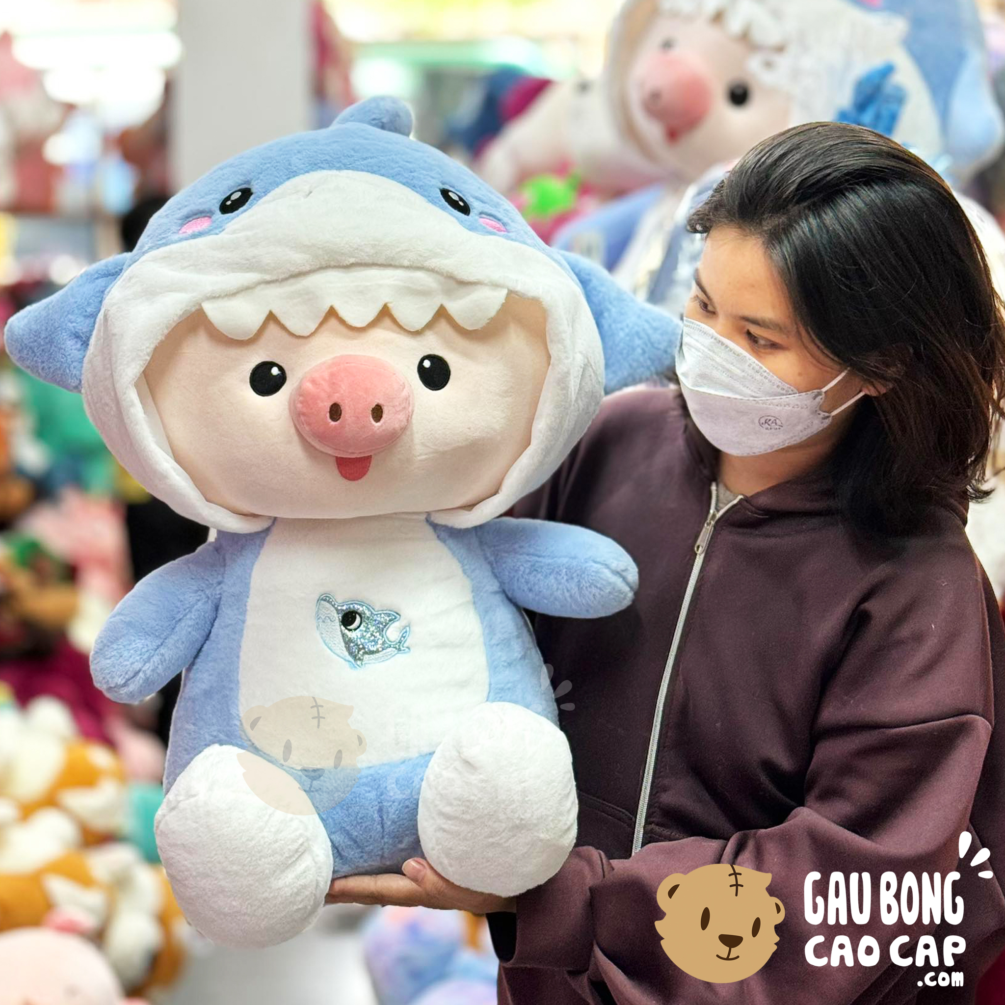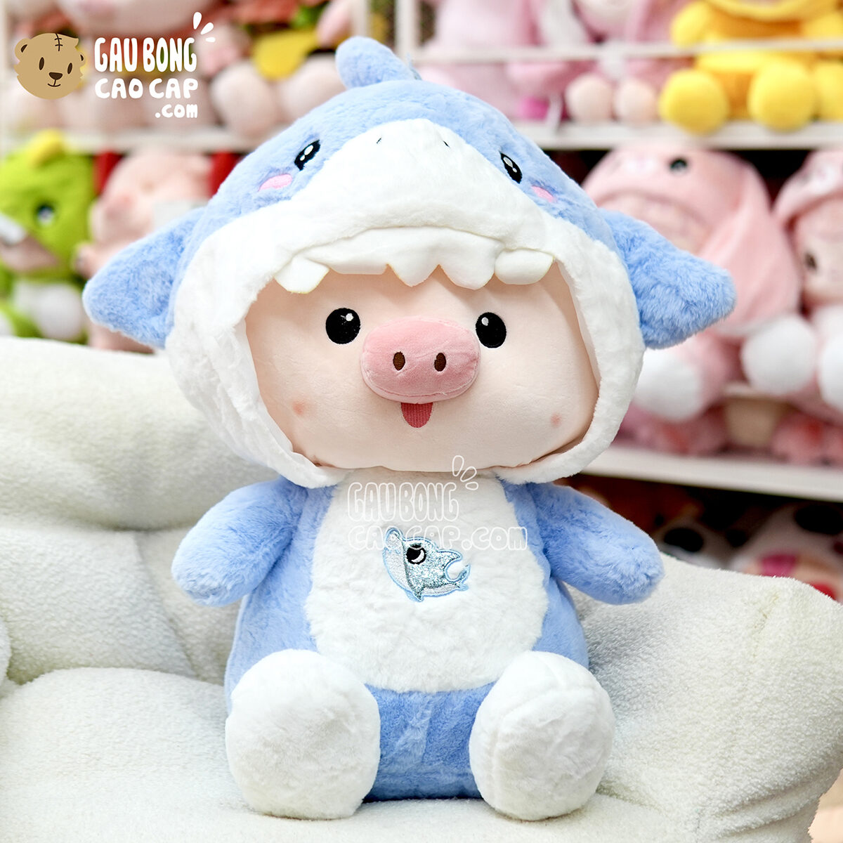 Trang Chủ / Gấu Bông Cao Cấp / Thú Bông / Heo Bông / Heo Bông Ngồi cosplay Cá Mập Baby Shark – Xanh