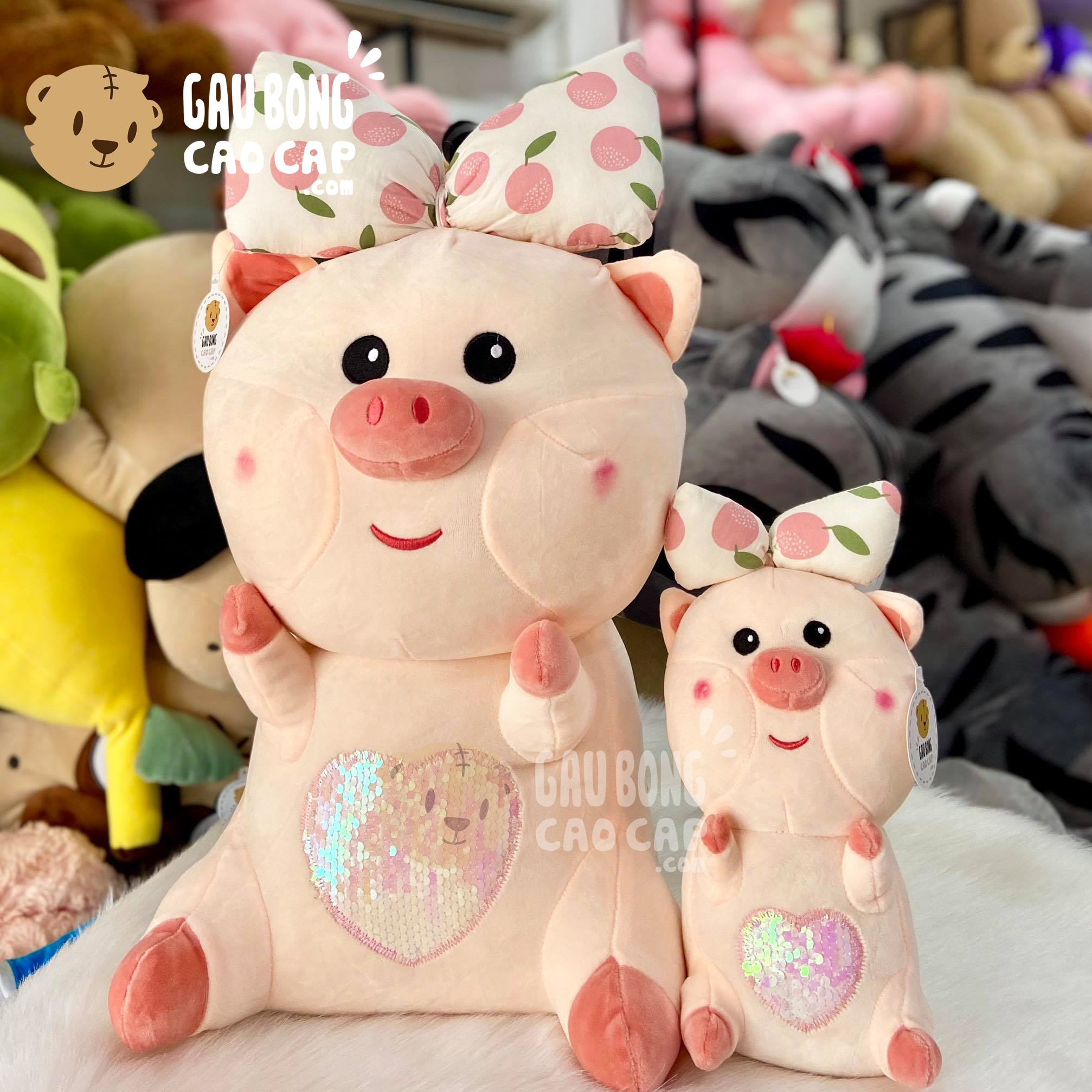 Heo bông ngồi đeo nơ Bụng Tim được thiết kế với 2 kích thước Gấu Bông lớn nhỏ khác nhau: 35cm, 60cm