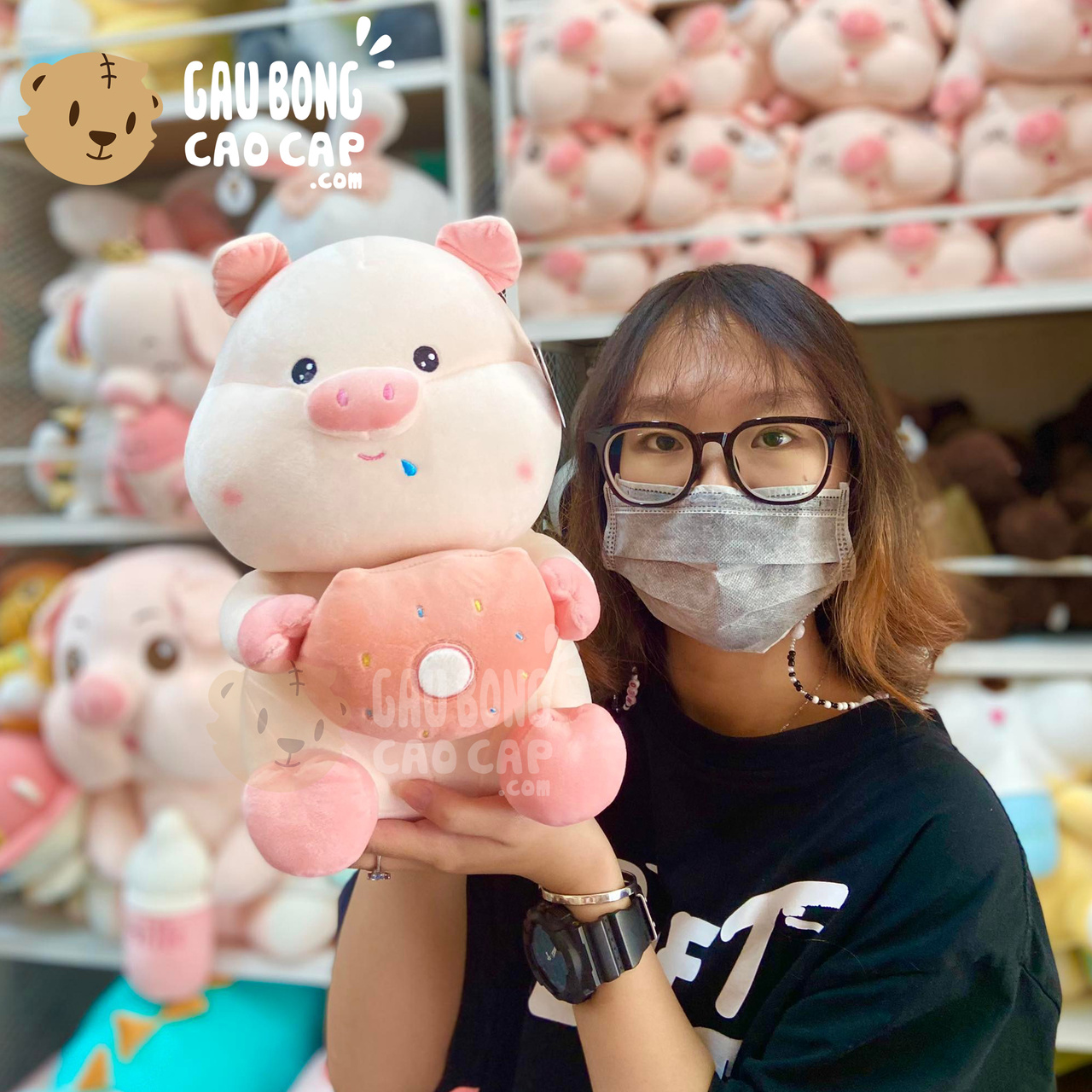 Hình ảnh Heo Bông nhí ôm bánh Donut, hình ảnh này là hình THẬT do Shop TỰ CHỤP.