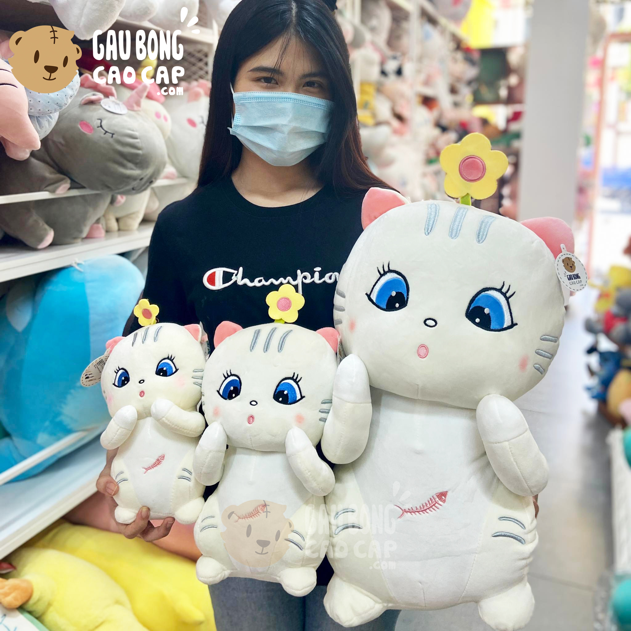Mèo Bông Trắng Mắt Xanh Ngồi Đội Hoa được thiết kế với 5 kích thước Gấu Bông lớn nhỏ khác nhau: 20cm, 30cm, 40cm, 50cm, 60cm