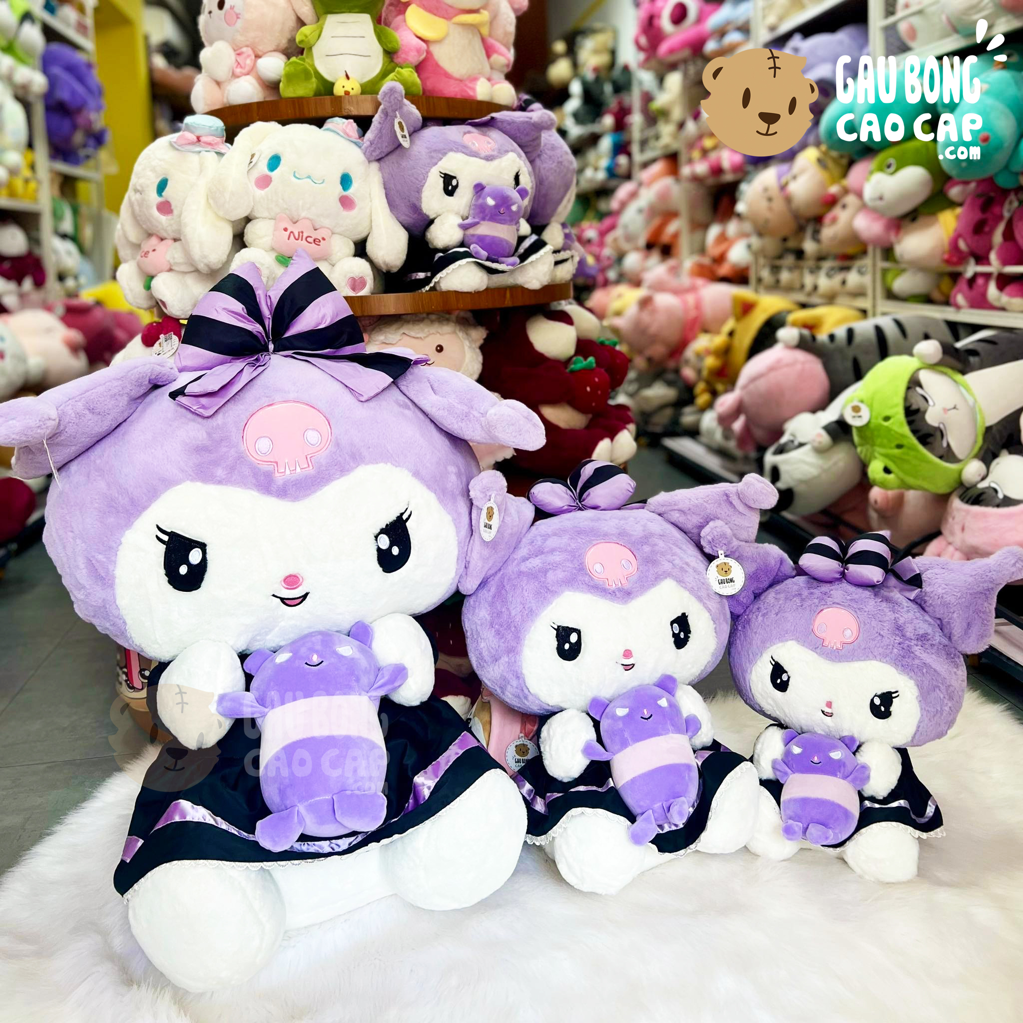 Thỏ Bông Kuromi mặc Đầm Đen Ôm Gấu Bông được thiết kế với 3 kích thước Gấu Bông lớn nhỏ khác nhau: 45cm, 60cm, 95cm