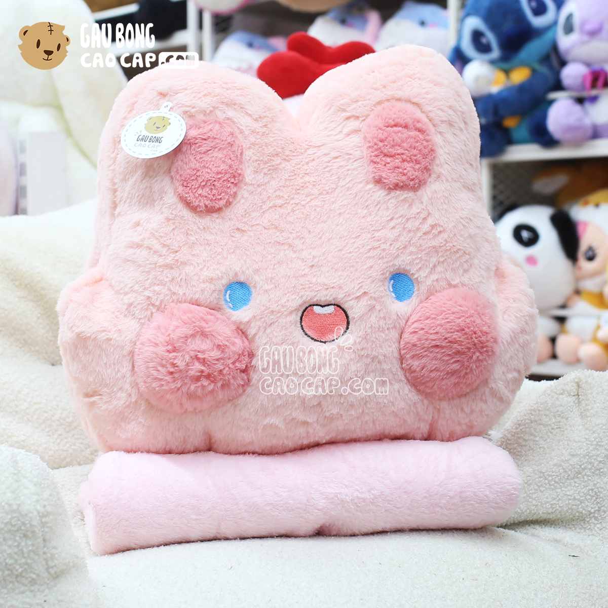 Trang Chủ / Gấu Bông Cao Cấp / Gối ôm / Gối Mền 2in1 / Thỏ Bông má hồng có mền 2in1