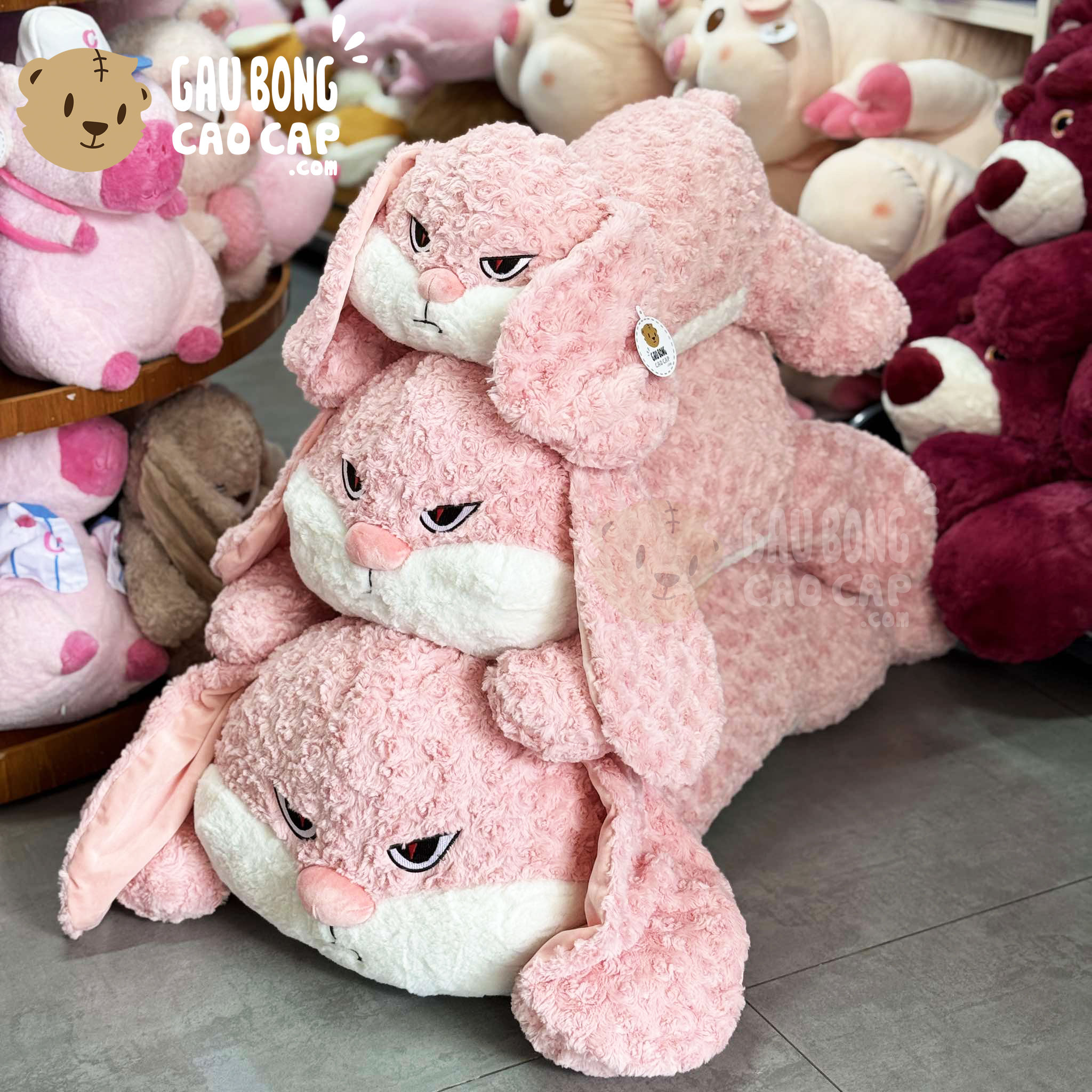 Thỏ Bông mặt Quạo form nằm - Lông xoắn Màu Hồng đang nằm trong danh sách những sản phẩm Gấu Bông Thú Bông BÁN CHẠY và đang được các bạn trẻ YÊU THÍCH NHẤT.