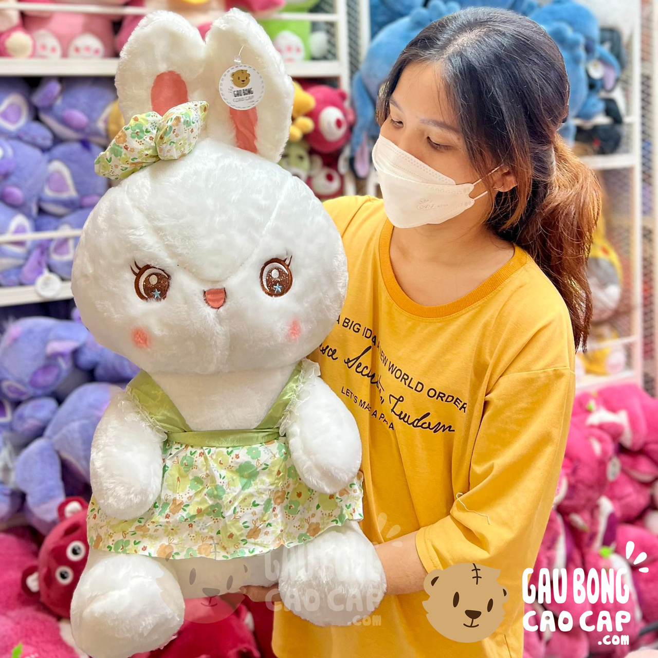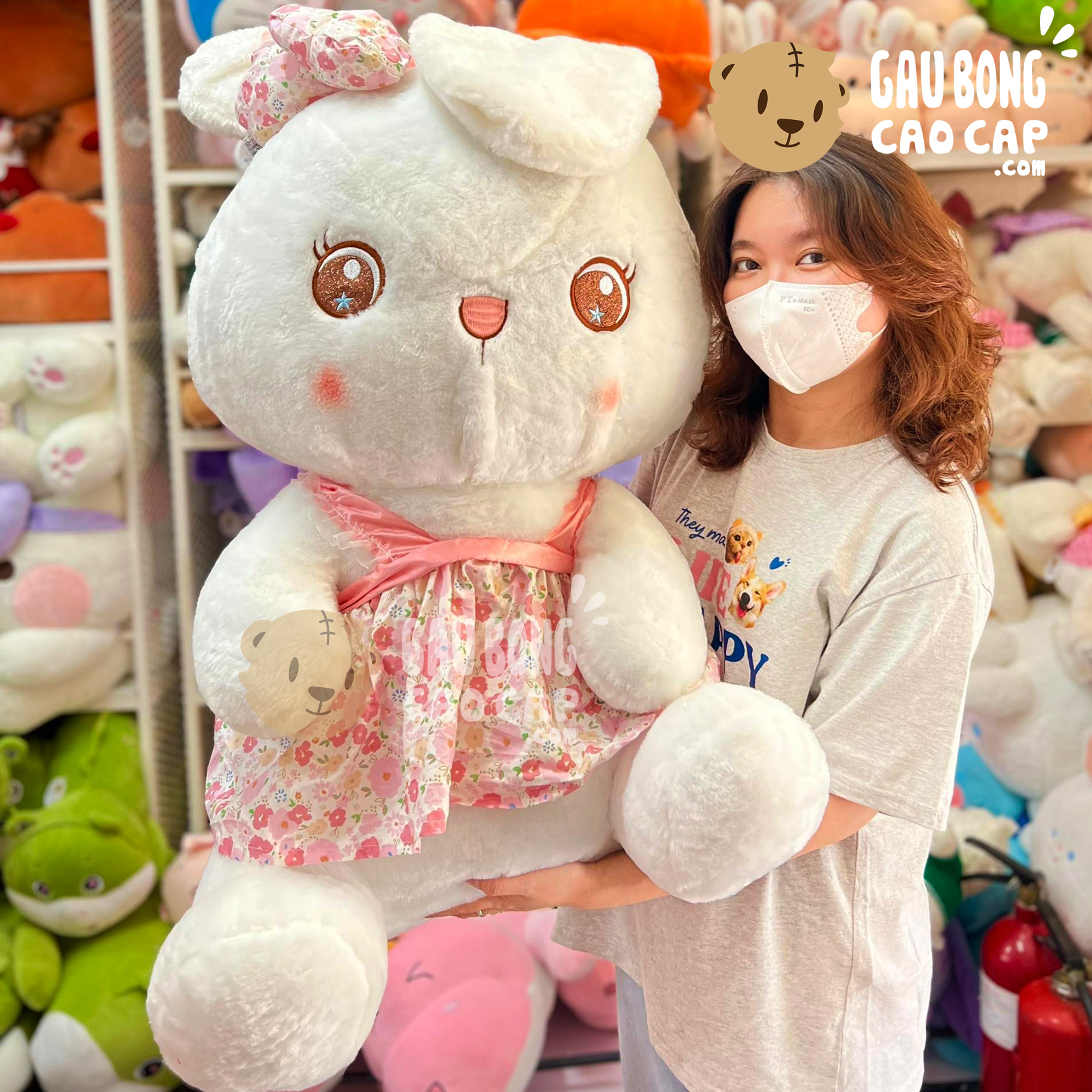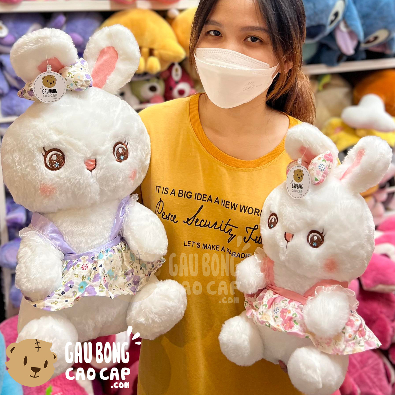 Thỏ Bông Trắng Ngồi Mặc Áo Hoa Mắt Sao được thiết kế với 2 kích thước Gấu Bông lớn nhỏ khác nhau: 45cm, 90cm